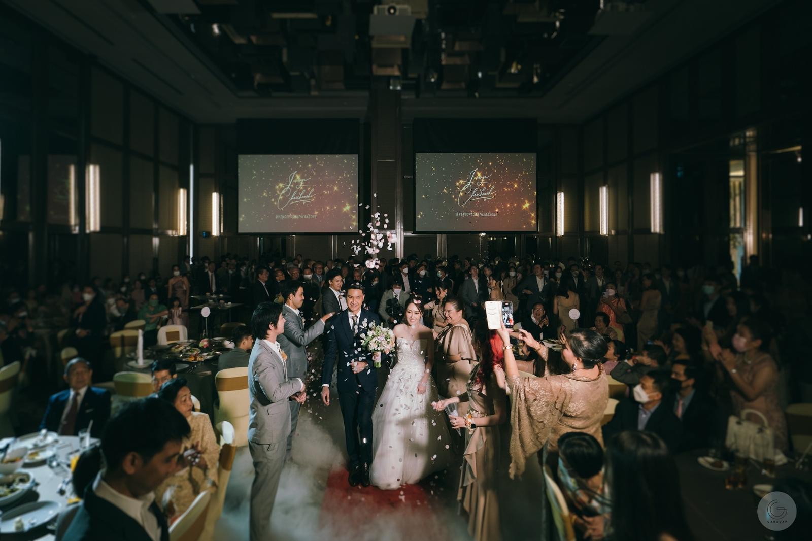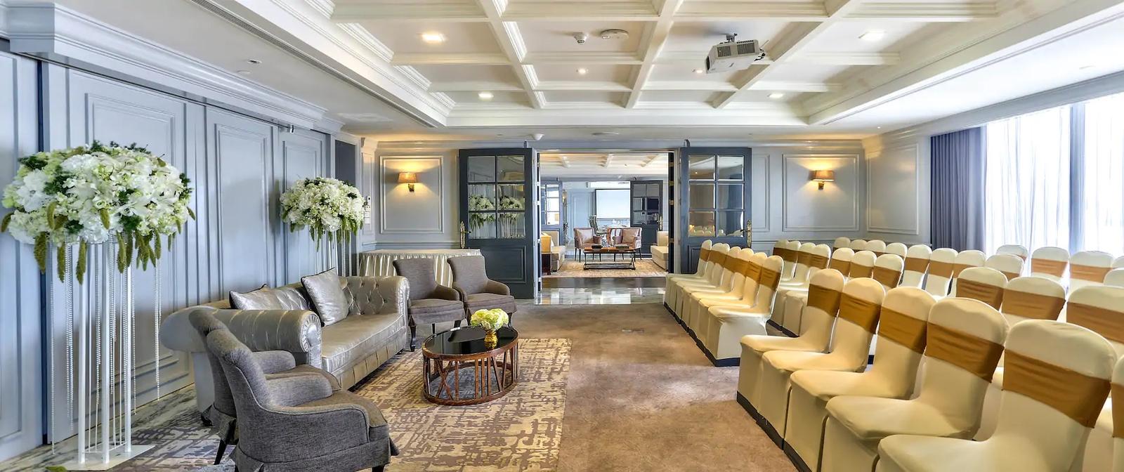 The Hilton Grand Ballroom, with its impressive 7-meter ceiling height, creates a sense of grandeur perfect for wedding dinners in Bangkok. With capacity for up to 350 guests for cocktail receptions or 220 for Chinese banquet-style celebrations, the venue offers versatility for different wedding formats.