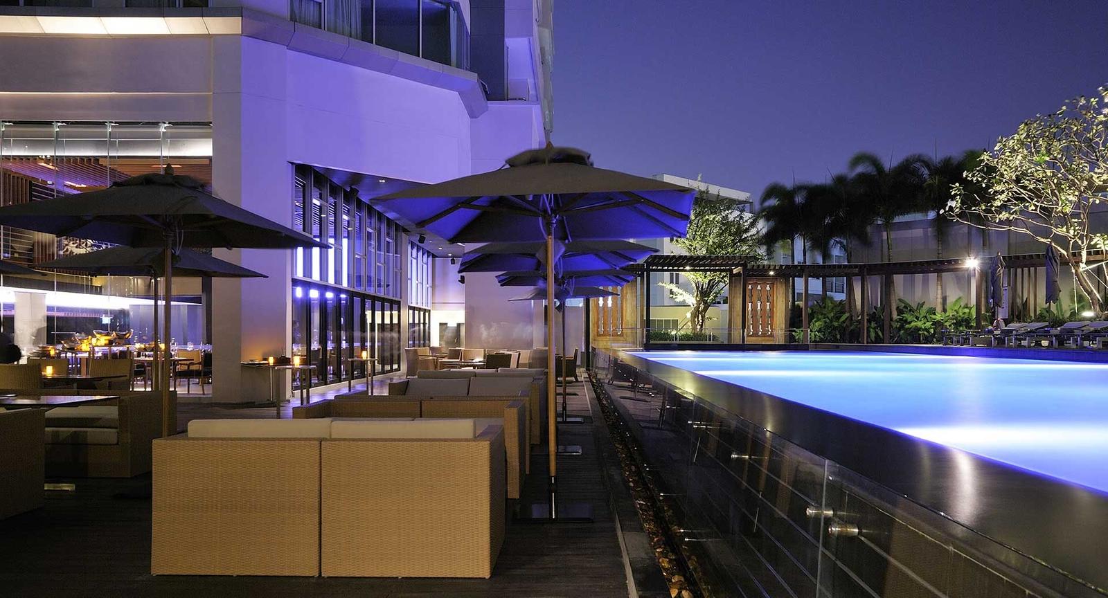 The architectural design of this high-rise hotel creates multiple opportunities for memorable wedding moments. The building’s sleek contemporary aesthetic provides an elegant canvas for any celebration style, from intimate gatherings to grand receptions. The rooftop dining area offers breathtaking panoramic views of Bangkok’s skyline, creating a dramatic setting for cocktail hours or romantic dinner celebrations. The infinity pool area adds another dimension to the venue’s appeal, with its spacious layout and ample seating arrangements that can accommodate various reception styles or pre-wedding social events.
