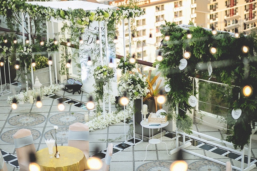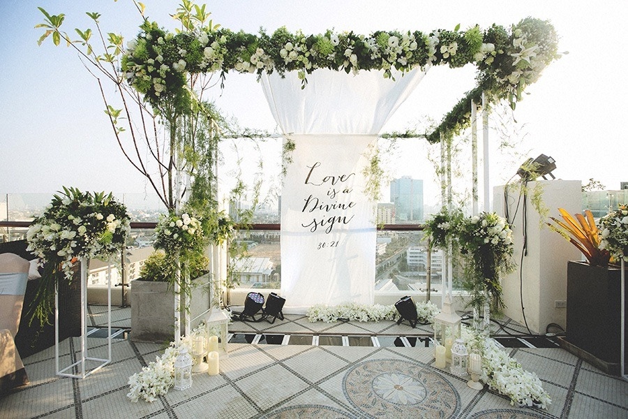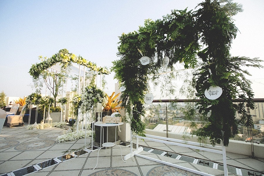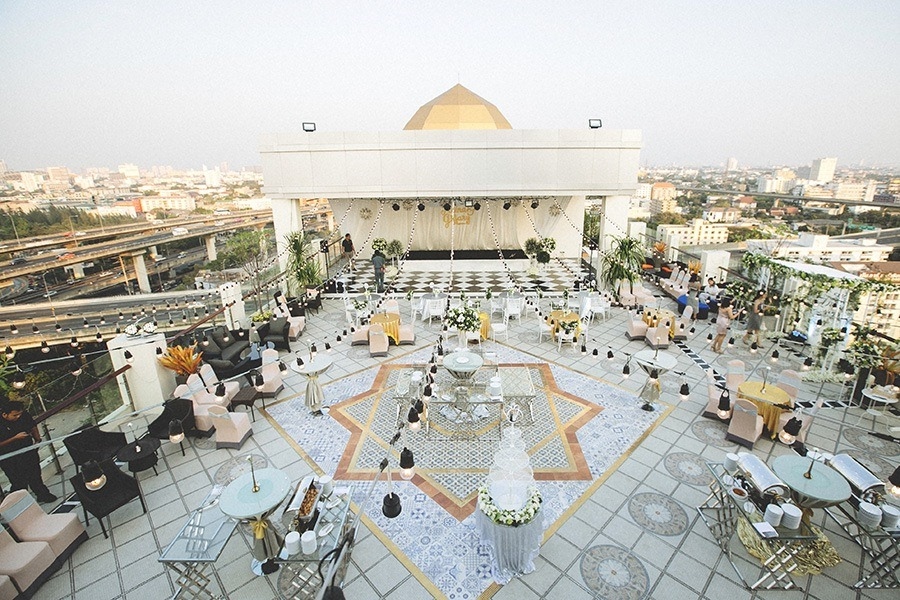 รูฟท็อปเทอเรซที่มองเห็นวิวเมืองกรุงเทพฯ เป็นทางเลือกสำหรับพิธีแต่งงานยามพระอาทิตย์ตกหรืองานค็อกเทลรีเซ็ปชั่น ขณะที่พื้นที่ในร่มให้ความมั่นใจเรื่องสภาพอากาศตลอดทั้งปี